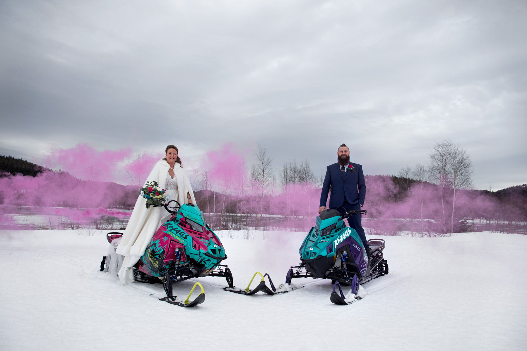 22. februar fikk jeg min første erfaring som bryllupsfotograf der brudeparet kjører snøscooter i bryllup! Nok en gang har jeg fått gleden av å utfordre meg selv som fotograf med nye props og artige og nye måter å gjøre ting på.